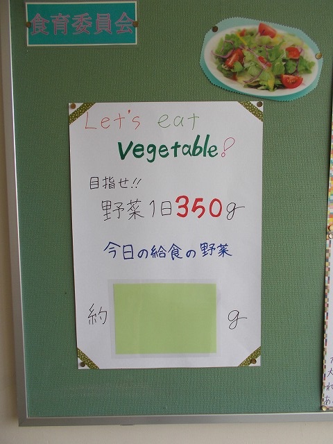 掲示板には、給食でとれる野菜の量が紹介されています。