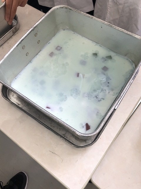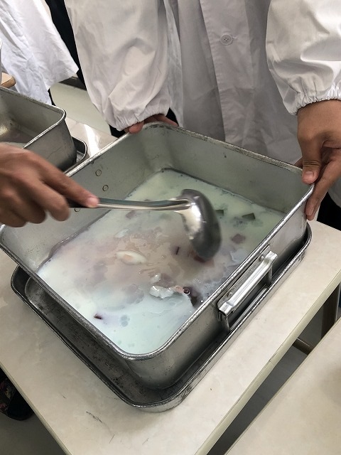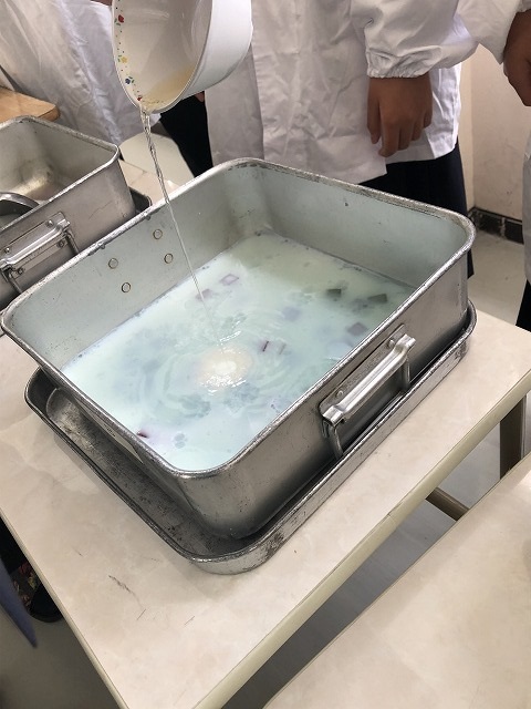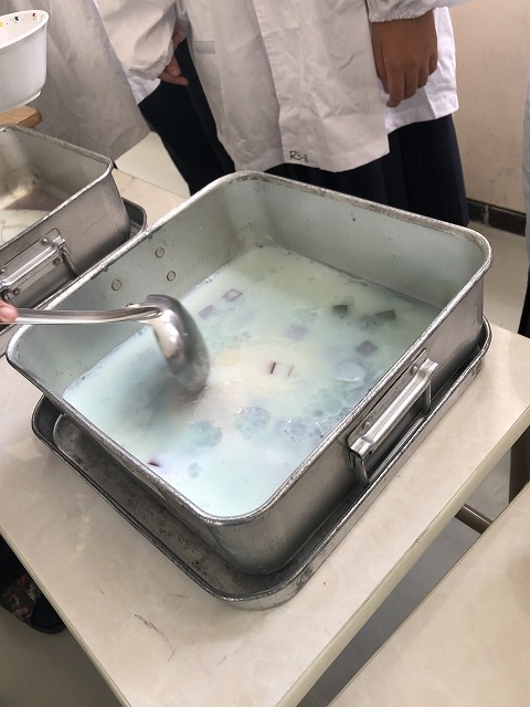今日の給食には変わったゼリーが出ました。「チェンジゼリー」です。何がチェンジするかというと、上にかけたシロップの色が変わるのです。最初の色は、バタフライピーというハーブから抽出した天然の「青色」です。この青色にはアントシアニンが多く含まれており、レモン果汁を入れることで「紫色」に変色していきます。それぞれの教室では、ゼリーにレモン果汁を入れる瞬間を、先生がタブレット端末を使って投影していました。1年生では楽しそうに見ている姿が印象的でした。