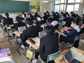 今年度から生徒一人一人に1台ずつタブレット端末が整備されました。今日は社会科の授業でタブレット端末を使用して調べ学習を行いました。