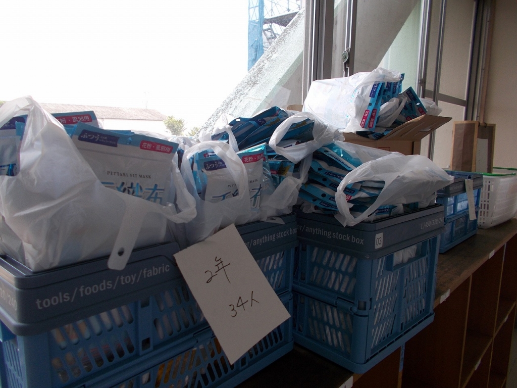 以前から不織布のマスクを寄附してくださっている 元八開中PTA会長様より、またまたマスクを寄附していただきました。生徒一人10枚入りのマスクを6袋ずついただきました。感染者数も桁違いに多い中、まだまだマスクが必要な日々が続きます。ありがとうございます。