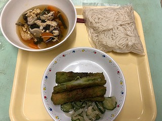 他にも、毎日給食の時に「今日の献立」を紹介しています。今日の給食は「禰豆子の竹」「炭治郎の卵とじ山菜うどん」「きゅうりと大根の昆布茶和え」でした。「禰豆子の竹」は、ちくわの天婦羅の衣に抹茶を混ぜたもの、山菜うどんは、炭治郎の好きなタラの芽にちなんで山菜が入ったものです。毎日の放送をじっくり聞くと、おもしろい情報がたくさんありますよ。