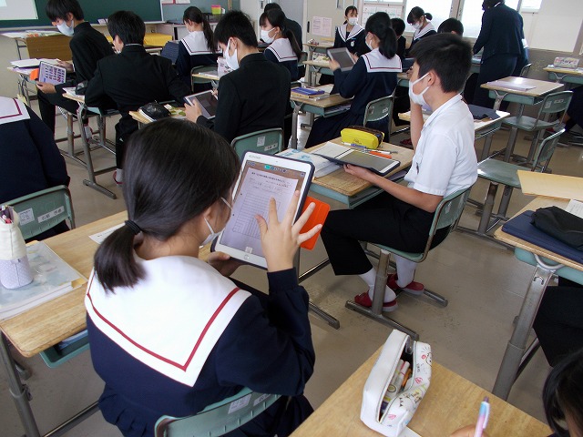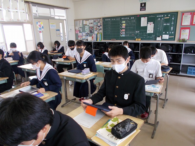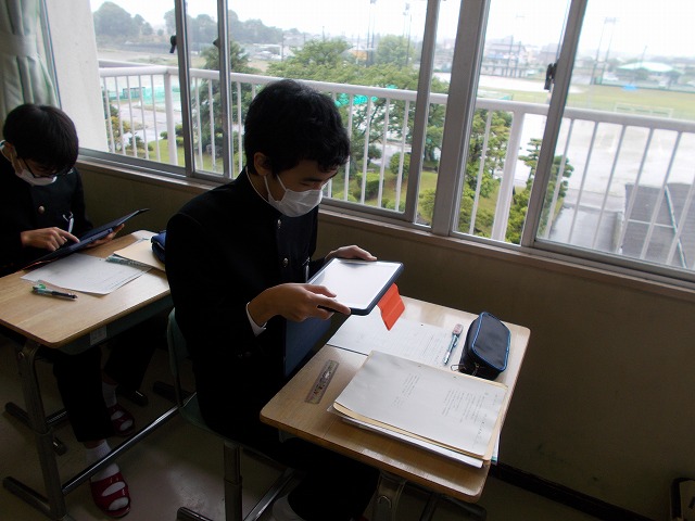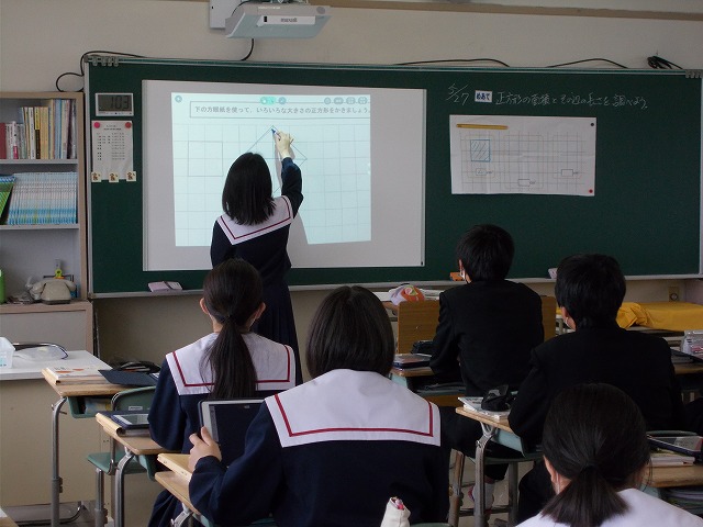 次は3年生です。この日は、数学の授業でいろいろな大きさの正方形をかいています。方眼紙にかいた正方形をタブレット端末を使って写真に撮り、どんな正方形ができたか、クラス全体で交流しています。面積が1㎠・2㎠…と順に調べていき、それぞれの正方形の辺の長さを測りました。さて、面積が1㎠の正方形の辺の長さは1㎝ですが、2㎠の正方形の辺の長さは一体?