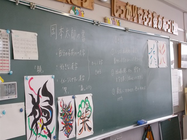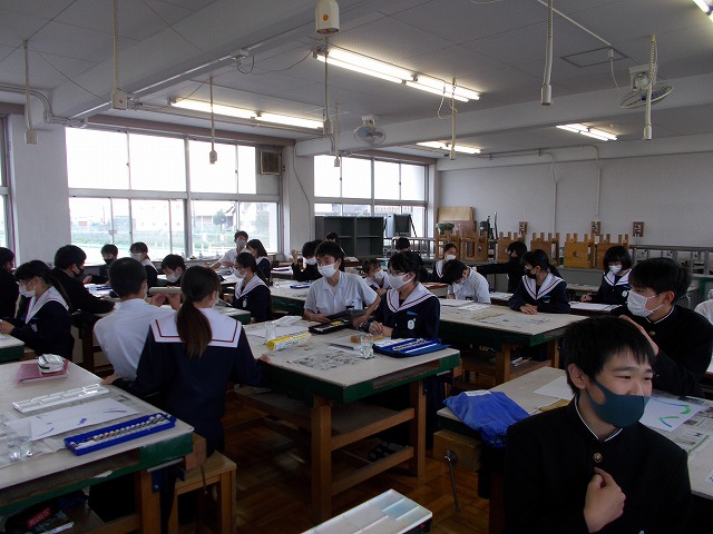 2年生は美術です。自分の名前の一文字や好きな漢字から1つ決め、八切画用紙に色をつけたり習字で文字を書いたりしてデザインしていきます。題材名は「岡本太郎の書」。どのような芸術作品ができるか楽しみですね。