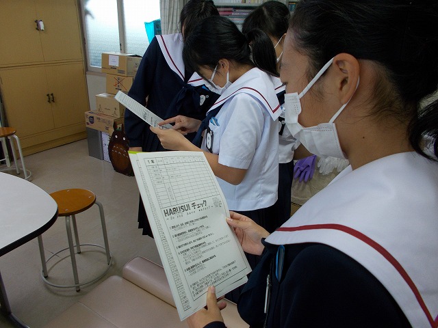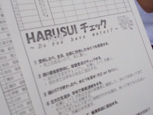 それに関連して、保健委員会では、熱中症対策の取組をしています。HABUSUI(ハブ水:Do you have water?)チェックです。朝の健康観察の時に保健委員が確認します。健康管理のためにとても大切なことですので、忘れた場合は各家庭に連絡して、家の方に持ってきていただくことになります。まずは忘れないこと、そして体育や部活動など、その日の活動内容や天候も考慮して、不足しない量を持ってくることを各自が心がけてください。