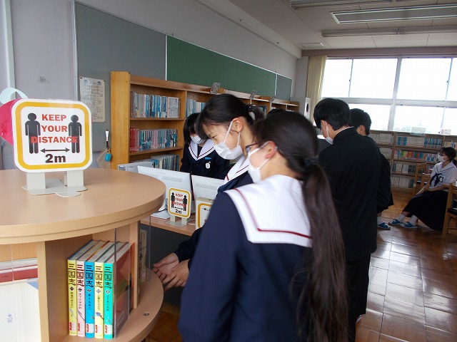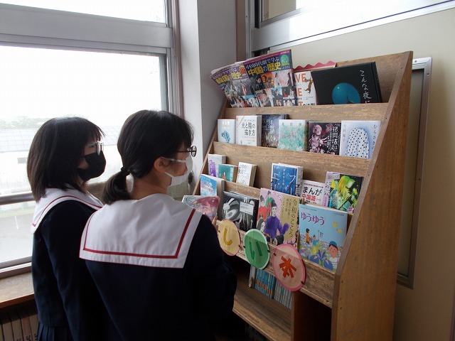 今日は図書室をのぞいてみました。毎日昼放課に、図書委員会が図書室を開館しています。とても短い時間ですが、今日もたくさんの人が本を借りたり読んだりしていました。新しい本のコーナーを手に取っている人もいます。好きなジャンルの本の話をしている人もいます。歴史の本「源義経」を借りていった人に話を聞いてみました。歴史に興味があるので、たくさんの歴史の本を読んでいるそうです。