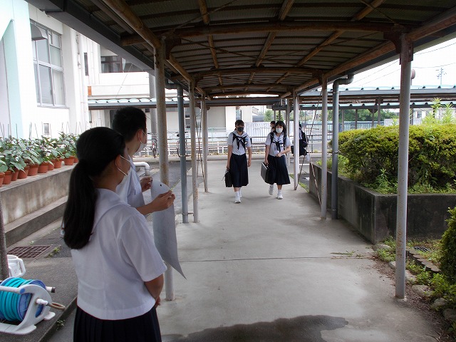 朝は生徒会役員さんと学級委員さんの「あいさつ運動」です。東西各昇降口と校内に分かれて月1度、1週間行っています。