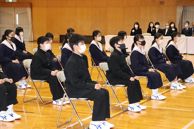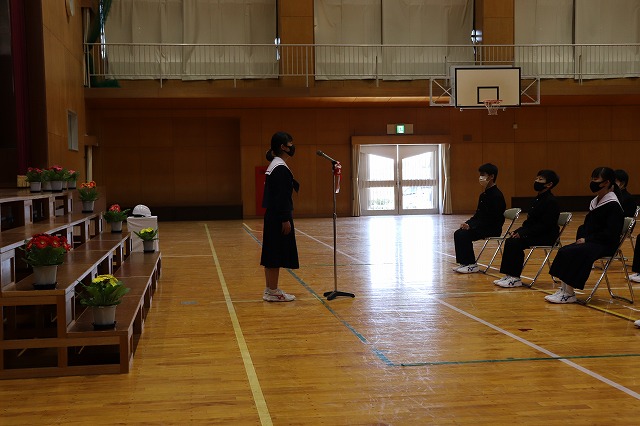 続いて、着任式と始業式を行いました。始業式では、感染症対策を意識しながら、全校生徒が体育館に集まりました。今年度の全校生徒数は97名です。生徒会長からの歓迎の言葉にあったように、少ない人数ですが、八開中学校の三つのモットーを意識しながら、一人一人の持ち味を十分に発揮し、活気ある八開中学校になることを願っています。