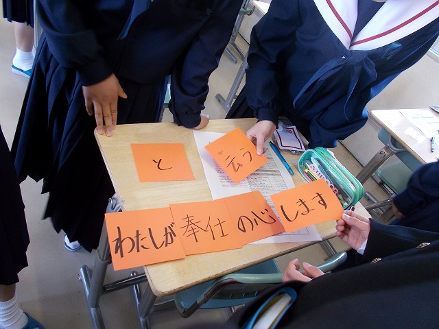 入学式・着任式・始業式が終わり、1年生の学級活動では、ある活動が行われました。教室中に「29枚のカード」がかくしてあり、それを探し出して、あるフレーズを組み立てる活動です。「黄色の人いますか~?」「青の人はどこ?」「この並び順でいい?」など、互いに異なる小学校同士の仲間が協力し合って完成させました。できあがった5つのフレーズは、1年生の学年目標です。これからも学年目標の5つの心を大切に、生活していきましょう。
