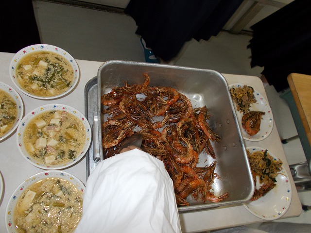 今日の給食には、車えびが登場しました。これは、農林水産省と日本海老協会の事業として、国産えびを味わってもらうために無償で提供してもらったものです。丸ごと食べられるようにから揚げにしてあります。