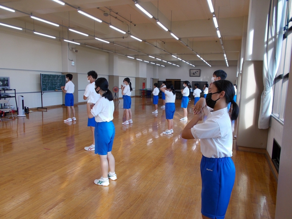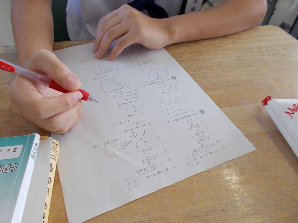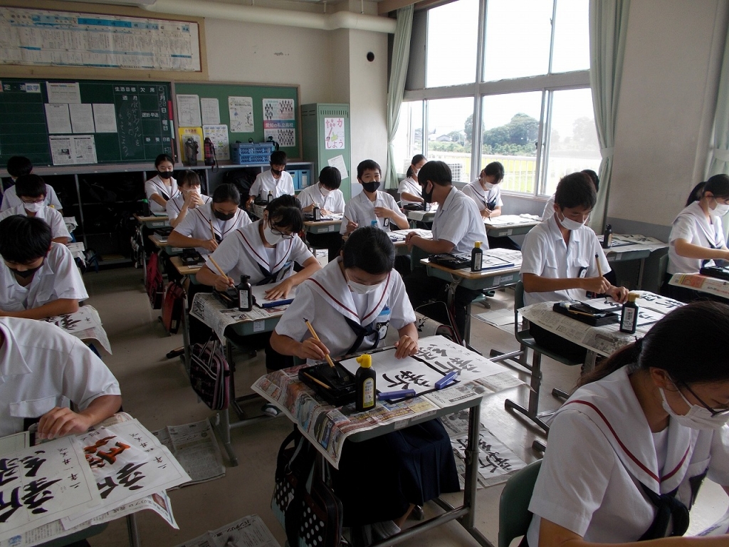 2年生は習字の時間です。書写コンクールの作品「新緑」を書いています。