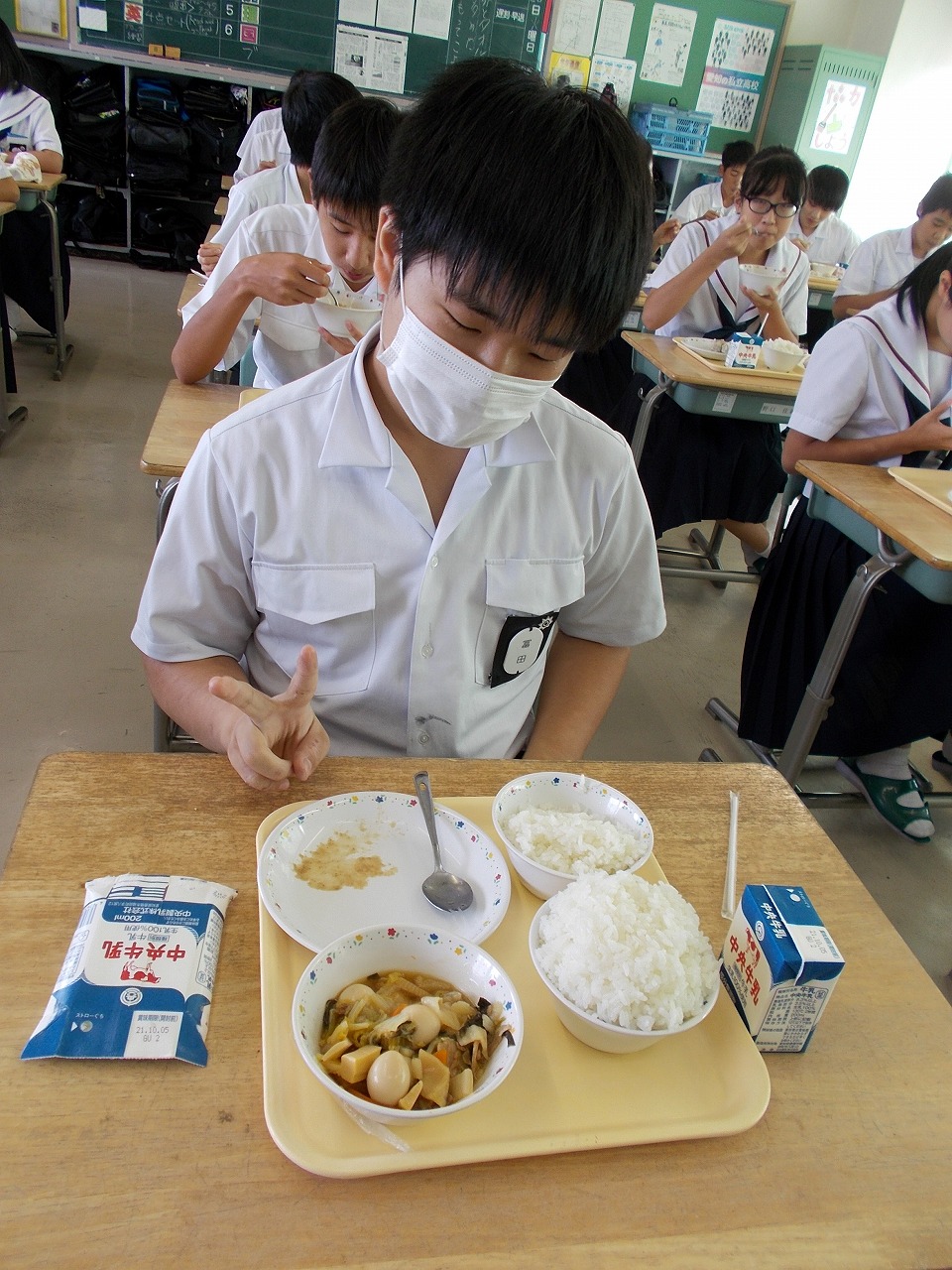 給食です。今日の献立は八宝菜と焼売。男子はたくさん食べていますね。