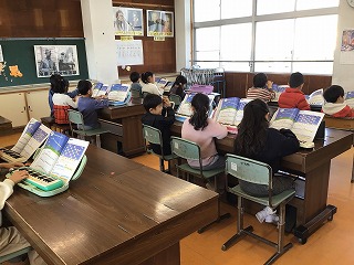 1年生は鍵盤ハーモニカで「きらきら星」の練習をしていました。音を出す前に階名唱しながら鍵盤を確認していました。全員で合わせて演奏することができました。