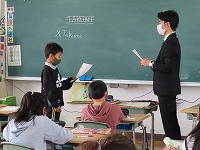 5年生の外国語では、名前と好きなもの・ことを伝える学習をしています。今日は、まず、自分の名前と好きなスポーツを名刺にかきました。その後、“How do you spell your name? ”What sport do you like?”という問いに対する答え方を知り、自分の名前のスペルと好きなスポーツを言えるようにしました。最後は、先生と会話形式で発表し、質問に対して正しく答える姿が見られました。