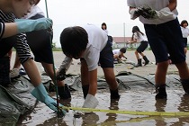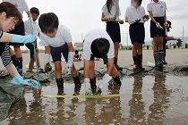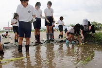 小雨が降る肌寒い日になりました。今日は、5年生が田植えをしました。先日ペットボトルに植え替えた苗が成長したので、子どもたちは長靴をはき、一本一本丁寧に苗を植えました。ほとんどの子どもは初めての体験だったので、戸惑いながらも楽しそうに歓声をあげる姿が見られました。これからさまざまな世話をし、おいしいお米を作っていきたいと思います。