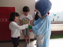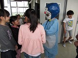 おなじみのキャラクターに変身した児童会役員が、募金箱を持って校内をまわりました。子どもたちは大喜びで募金をしていました。