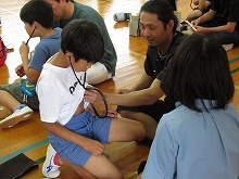 授業の後は、体育館で、エフ・フィールドの方に「いのちの授業」をしていただきました。聴診器を使って、自分や家族の心臓の音を聞きました。命について、考えるきっかけをいただきました。
