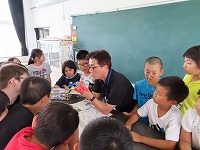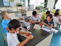 4年生は、理科で「電気のはたらき」について学習しています。今日は、電流の向きを変えて、モーターの回る向きを調べました。はじめに、先生の周りに集まってプロペラの回る向きを確認します。次に、先生からの「電池の向きを変えるとどうなりますか」の問いに対して、子どもたちは予想を立てました。そして、自分の席に戻ると、ひとりひとり実験をして結果の確認です。電池の向きを変えた時の、電流の向き、モーターの回る向きについて、実験結果からどんなことが言えるか考えました。