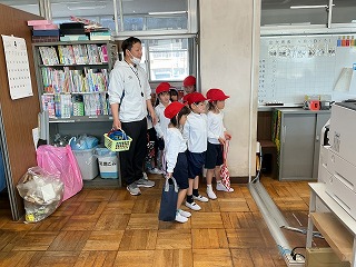 1年生は、体育館の鍵を借りる練習をしていました。係のお仕事も少しずつ始めています。(3枚目は給食2日目、配膳の様子です)