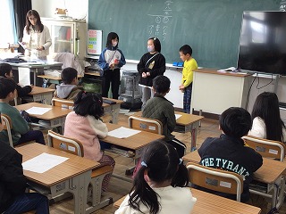 今週の金曜日に3年生が1年生を招待して交流遊びをする予定です。そのために今日の朝の時間に3年生が1年生の教室に来て、交流遊びについてプレゼンをしました。5つの遊びについて、それぞれのチームが一生懸命説明をしていました。