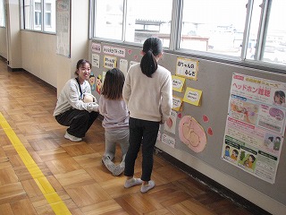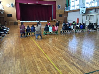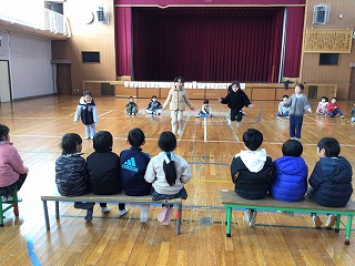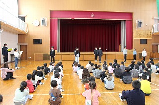 今日は、白百合保育園の年長児さんたちと1年生・5年生との交流会がありました。始めに1年生がこの1年間でできるようになったことの作文発表をした後、できるようになったことをチームごとに発表しました。その後、5年生がリーダーになって、さまざまな遊びで交流活動をしました。交流会が終わった後、6年生に年長児さんが卒業のお祝いをしてくださいました。とても素敵な会でした。