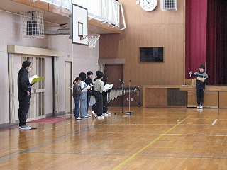 朝礼後、今年度と来年度の児童会役員の交代式がありました。
