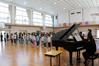 1年生は鍵盤ハーモニカで「きらきら星」の練習をしていました。音を出す前に階名唱しながら鍵盤を確認していました。全員で合わせて演奏することができました。