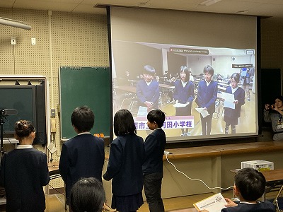 3月3日、5年生でNHKメディアリテラシー教室に参加しました。全国各地の小学校4校と、NHKの放送局を中継でつなぎ、自分たちの学校ののよいところを発表したり、映像の撮り方、編集が与える効果についてみんなで考えたりしました。