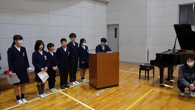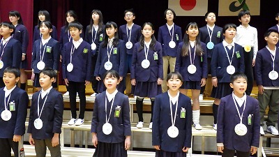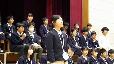 全校朝礼が行われました。前期の児童会役員の認証が行われました。また、校長先生より、言われていやな言葉や言われてうれしい言葉について、いじめについての話がありました。今のクラスで過ごせるのも、残りわずかです。お互いを大切にして、気持ちよく過ごしていきましょう。