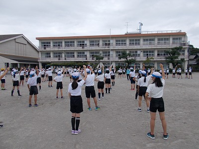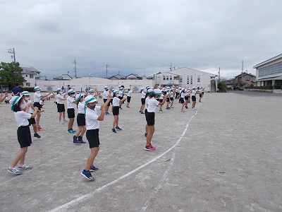 今日は5・6年が運動場で演技の練習をしました。隊形移動の確認をした後、初めて旗を使って演技を行いました。