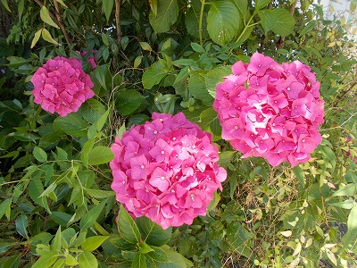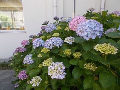 校庭のアジサイがとてもきれいに花を咲かせています。赤や青、紫など、様々な色のアジサイが目を楽しませてくれます。