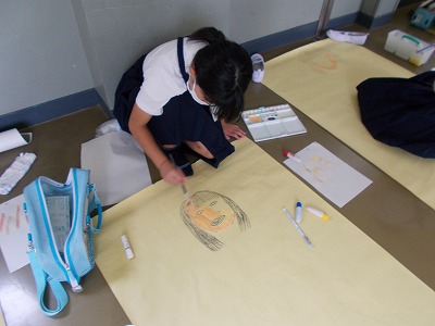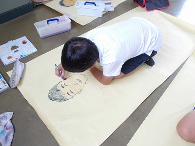 今日は4年生が、等身大の絵の制作を行いました。家庭で自分の体の輪郭を大きな紙に写して、学校で顔を描き、色塗りを行いました。完成した作品は、2分の1成人式の当日に展示する予定です。