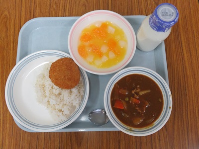 麦ごはん、牛乳、カレーライス、キャベツ入りミンチカツ、ナタデココポンチ