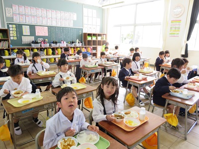 辛いかな?量はどうかな?と心配していたカレーも「おいしい!」とたくさん食べてくれて、牛乳もしっかりと飲んで、2クラスとも完食でした。給食も学校に来る楽しみの一つになるといいなと思っています。