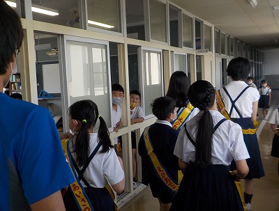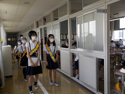 今日から1週間、児童会によるあいさつ運動が行われます。朝放送であいさつ運動を行うことを全校に伝えた後、児童会役員が教室をまわって「おはようございます」とあいさつをしました。