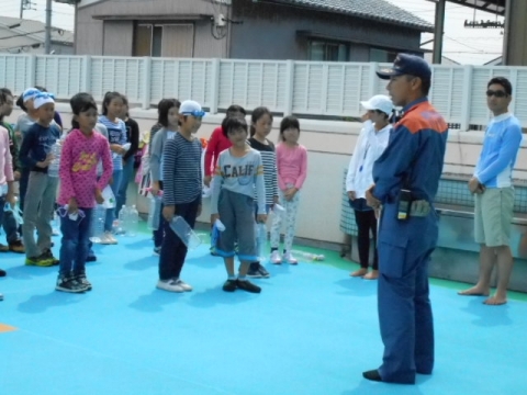 愛西市消防署員の方を講師にお招きして、5年生が5・6時間目に洋服を着たまま水に入る着衣泳を行いました。