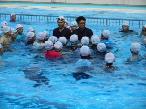 子どもたちは、洋服を着て靴を履いたまま水に入ると、体が重くなり、動きにくいことに驚いていました。