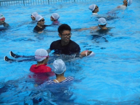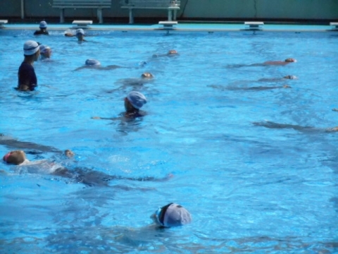 少し慣れた後、体の力を抜いて、水に浮かぶコツを教えてもらいました。また、背浮きをしたまま、平泳ぎのように手足を使って進む方法も教えてもらいました。