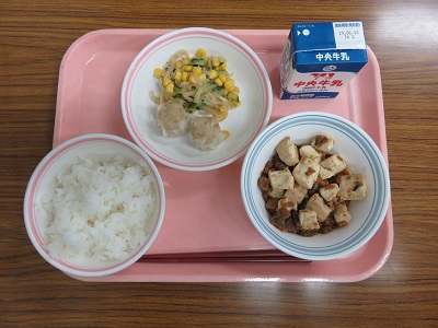 ごはん、牛乳、ナス入り麻婆豆腐、しゅうまい、切干大根のナムル