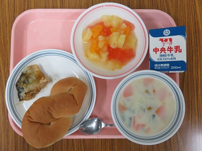 クロスロール、牛乳、鯖のバジルレモン、豆乳スープ、カルピスのフルーツカクテル