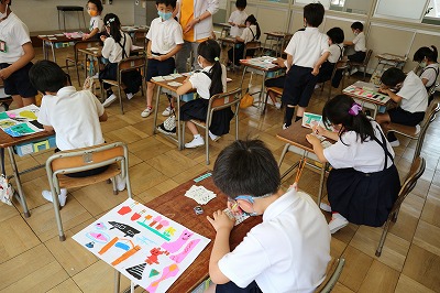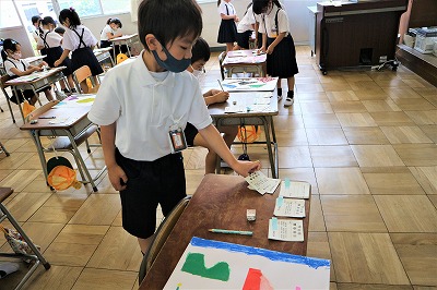 1年生の図画工作の授業で「やぶいたかたちから うまれたよ」の作品を鑑賞しました。5種類の賞状の中から、友達の作品にぴったり合う賞状を選んで、友達に渡しました。