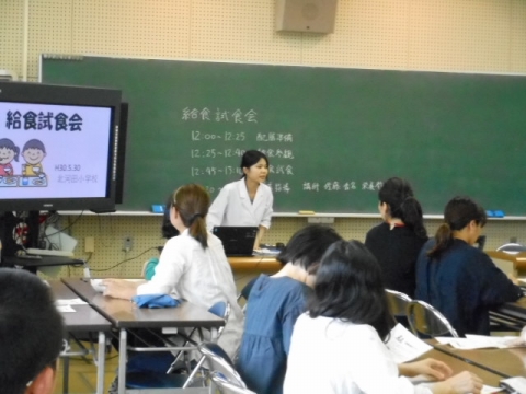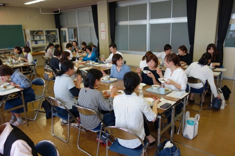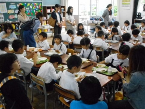 1年生の子どもたちの給食の様子を参観した後、場所を視聴覚室に移して、給食を試食しました。