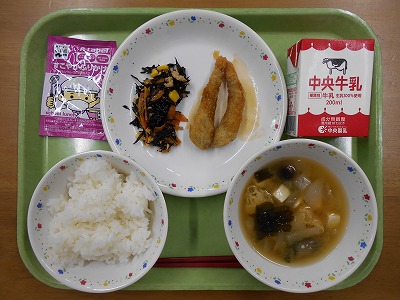 ご飯 牛乳 めひかりフライ和風ソース ひじきの炒め煮 新たまねぎのみそ汁 おかかふりかけ
