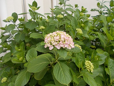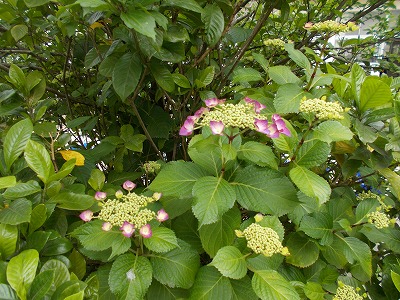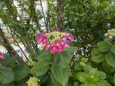 例年より早い梅雨入り宣言に合わせたように、中庭のアジサイが咲き始めました。満開になるのが楽しみです。