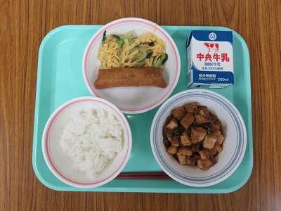 ごはん、牛乳、生揚げの中華炒め、春巻き、バンサンスー