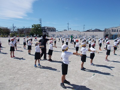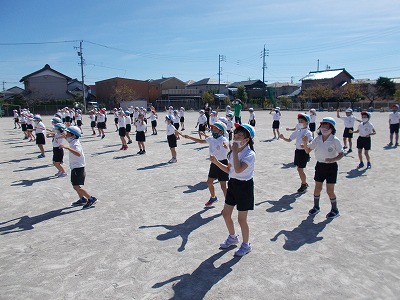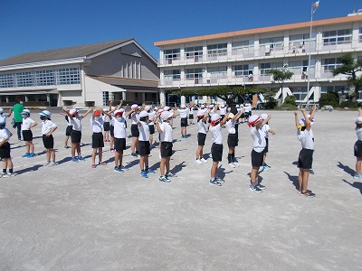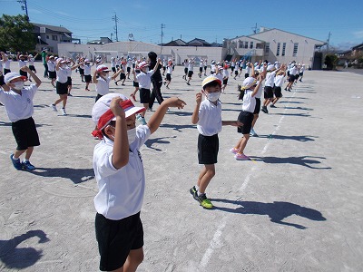 今日は1・2年生が初めて運動場で演技の練習をしました。曲の途中で行う体形移動も、先生の指示を聞いてがんばって行うことができました。
