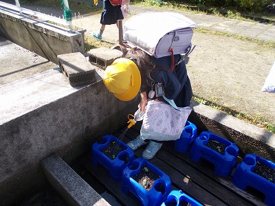 2・3年生は毎朝登校すると、育てている植物に水をあげています。連休明けの今日も、水やりを行いながら「芽が出たよ!」と教えてくれました。