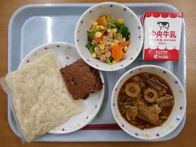 きしめん 牛乳 肉みそきしめん ブロッコリーサラダ 手作りチョコレートケーキ