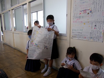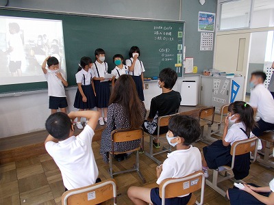前回の3年2組に続いて、今日は3年1組が会社発表会を行いました。楽しいパフォーマンスや仕事内容の説明などを、工夫を凝らしながらしっかりと行うことができました。