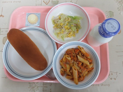 小型ロール、牛乳、ペンネマカロニのトマトソース、春キャベツのサラダ、型抜きチーズ