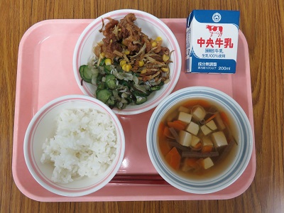 ごはん、牛乳、豚肉とごぼうの揚げ煮、塩昆布和え、けんちん汁